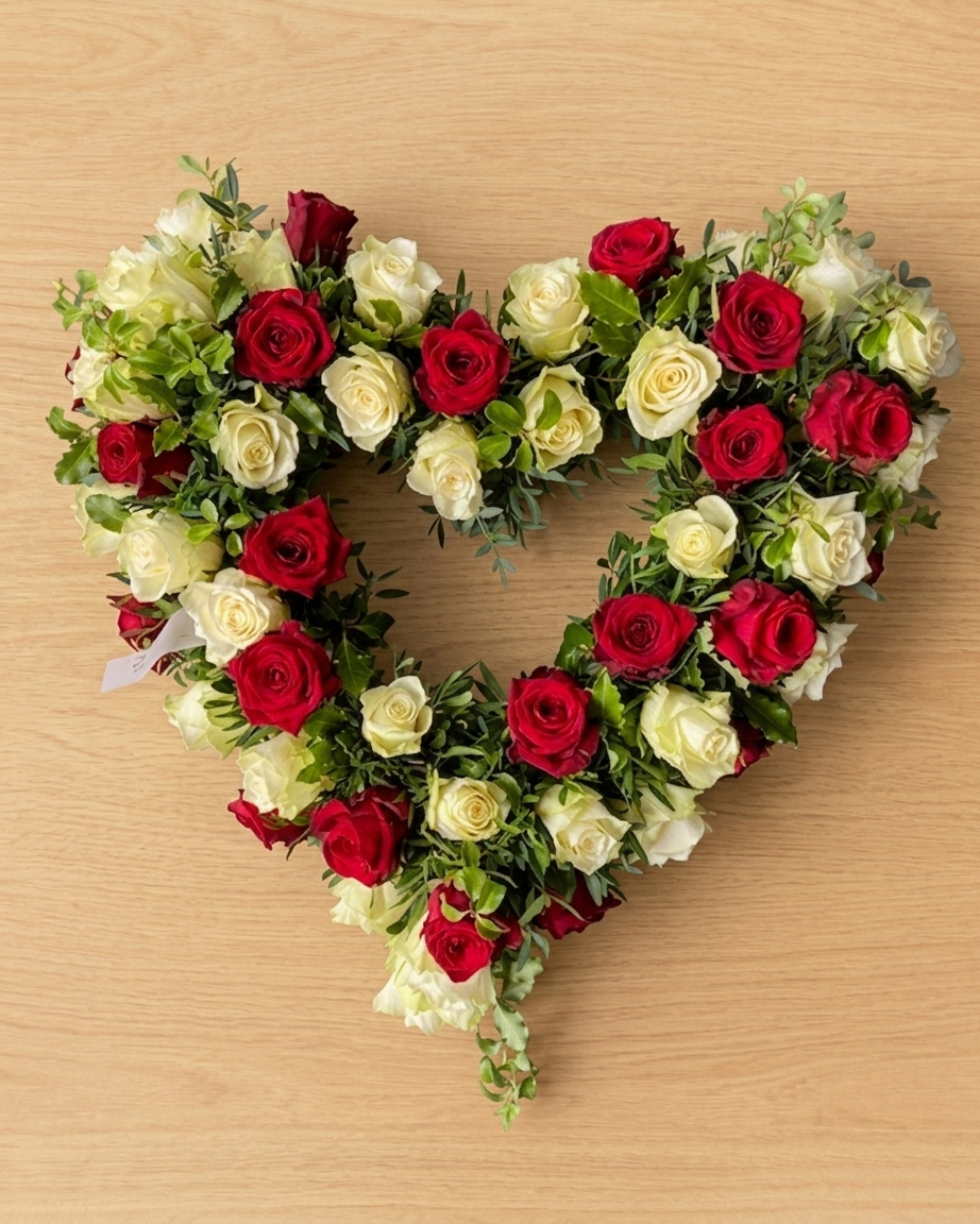 Composition florales en forme de coeur composé de roses rouges et blanches.